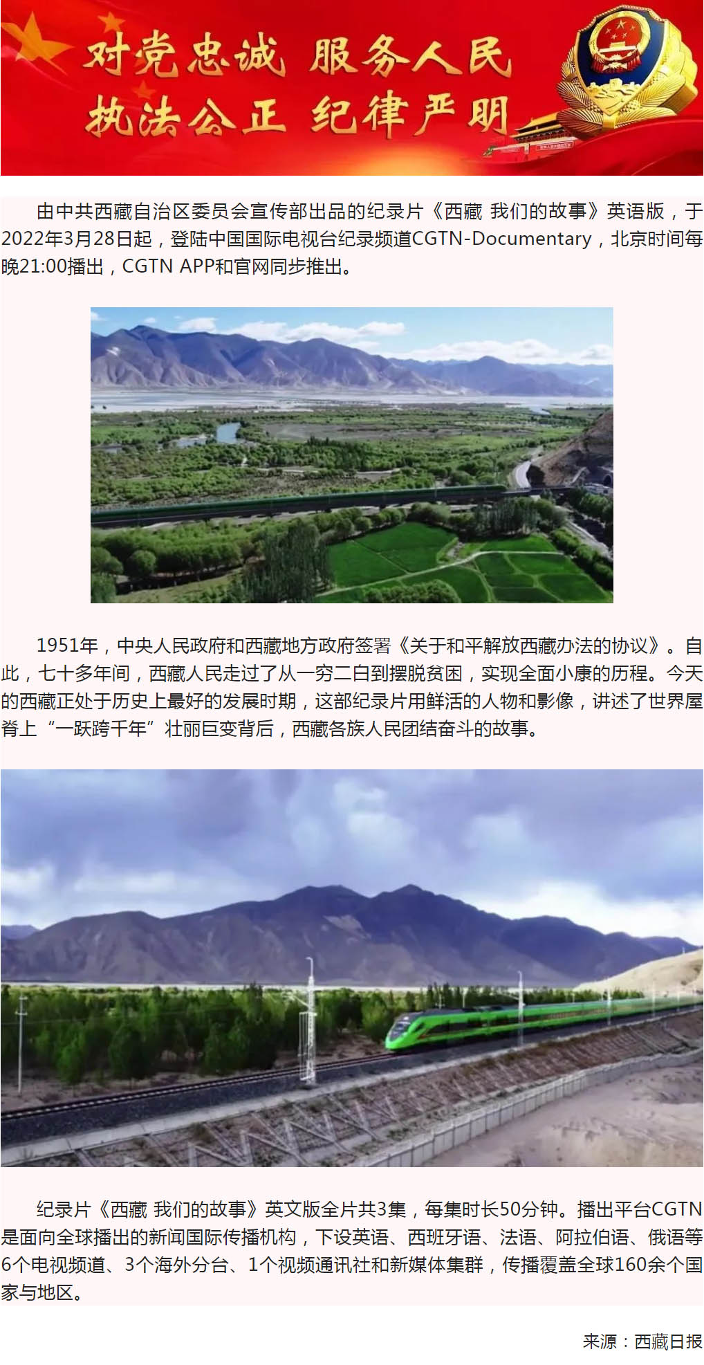 由中共西藏自治区委员会宣传部出品的纪录片《西藏 我们的故事》英语版,于2022年3月28日起,登陆中国**电视台纪录频道CGTN-Documentary,北京时间每晚21:00播出,CGTN APP和官网同步推出。